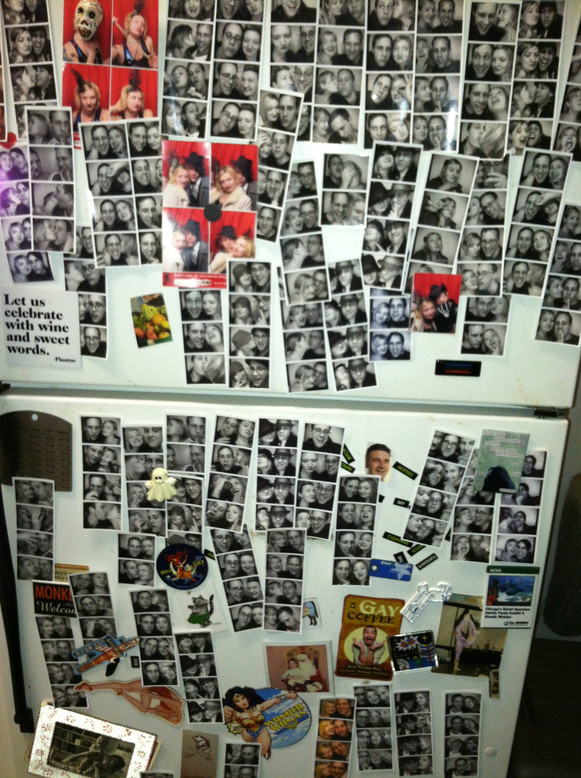My older daughter Julie is a huge fan of photo booths. She and her roommate Ken have filled their refrigerator with their many photo booth experiences and interesting refrigerator magnets. Refrigerator magnets always remind me of an even awkwarder than usual interaction Alex Trebek had with a contestant during the interesting tidbit segment of Jeopardy many years ago. It went something like this, “So you collect refrigerator magnets” said Alex and then with a very puzzled expression, “so where do magnets come from in old refrigerators?” It took the contestant a minute to realize that he was going to have to explain the concept of a refrigerator magnet. Alex’s refrigerator must be quite bare – especially compared to Julie and Ken’s!