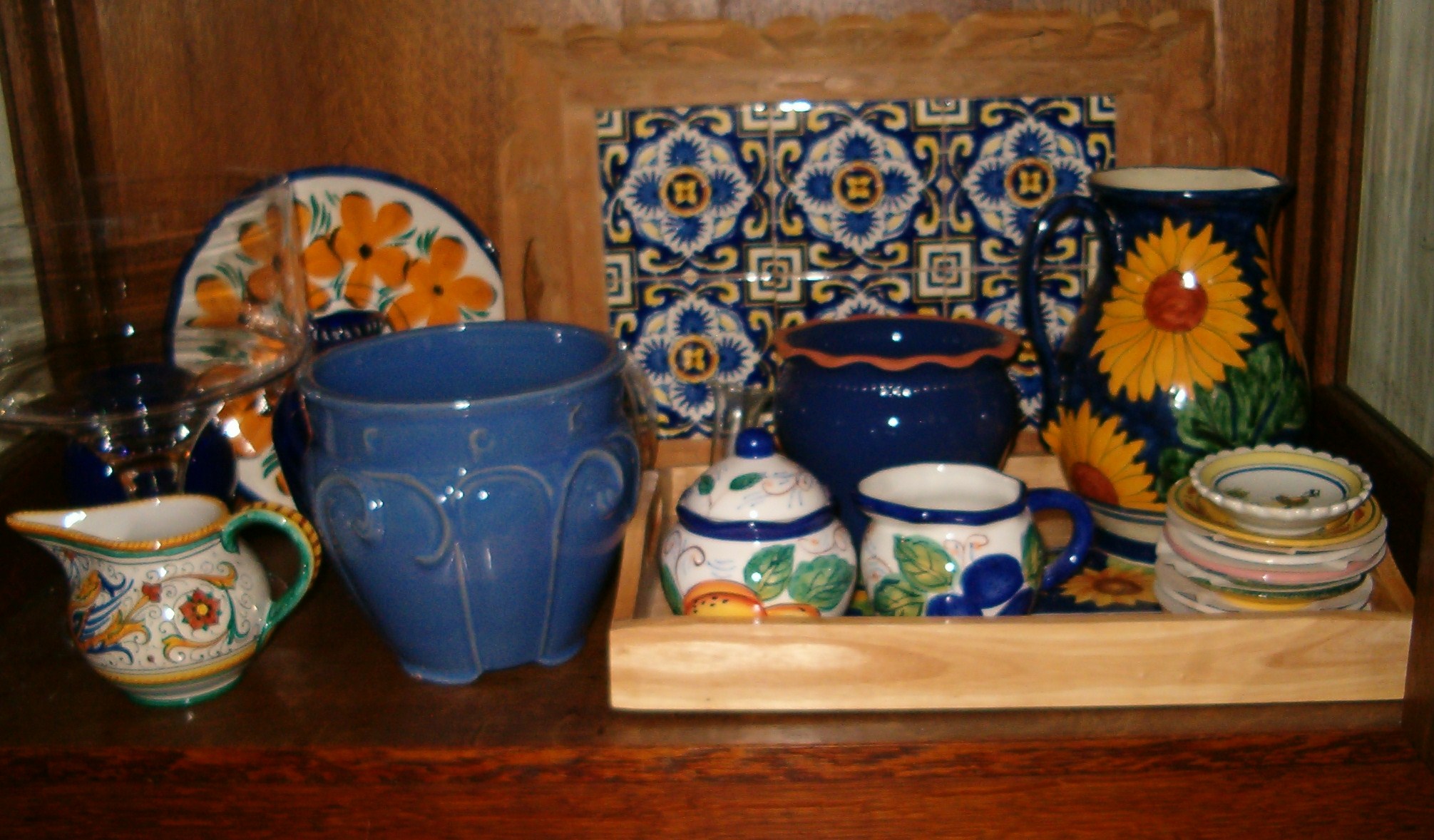 The bottom shelf is a bit more eclectic than the top two as I am actually using it as a china closet rather than a display case because I store the wonderful trifle dish my daughter Molly gave me for my birthday last year on it. Next to that is a blue pot that came from my husband’s mother. She was a ceramicist and made the flower plate behind the two pieces but I don’t think she made the pot. While it has no markings I think it is an arts and craft pot. In front of the trifle dish is a small pitcher from Italy, a tag sale purchase that both my sister and I wanted but that I snagged. There are some glass vases behind the blue pot. Next to the flowered plate is a tray with Mexican tiles and in front of that a pitcher from Mexico with sunflowers that my parents gave me sitting on another tray this one with a sunflower tile. Also on the tray is a stack of Quimper little plates from my grandmother and a new “made in China” creamer and sugar bowl. Behind them another blue pot, I think it came from a florist with an arrangement but its color and shape go well with the arts and craft pot. Click the picture to see the whole shelf.