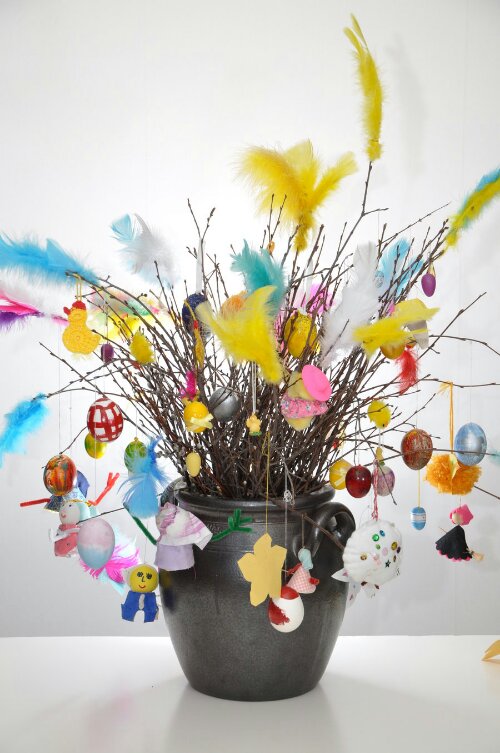 A new addition this year are the brightly colored feathers at the end of some branches. These are in honor of the Swedish Easter trees called Paskris which traditionally sport feathers, eggs, paper roosters, yarn ball chickens, crocheted catkins (which apparently look like hotdogs) and pipe cleaner witches. I found out about Paskris when I pinned a tree from Aunt Peaches on my pinterest board “fall and spring trees”. http://www.auntpeaches.com.