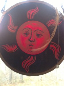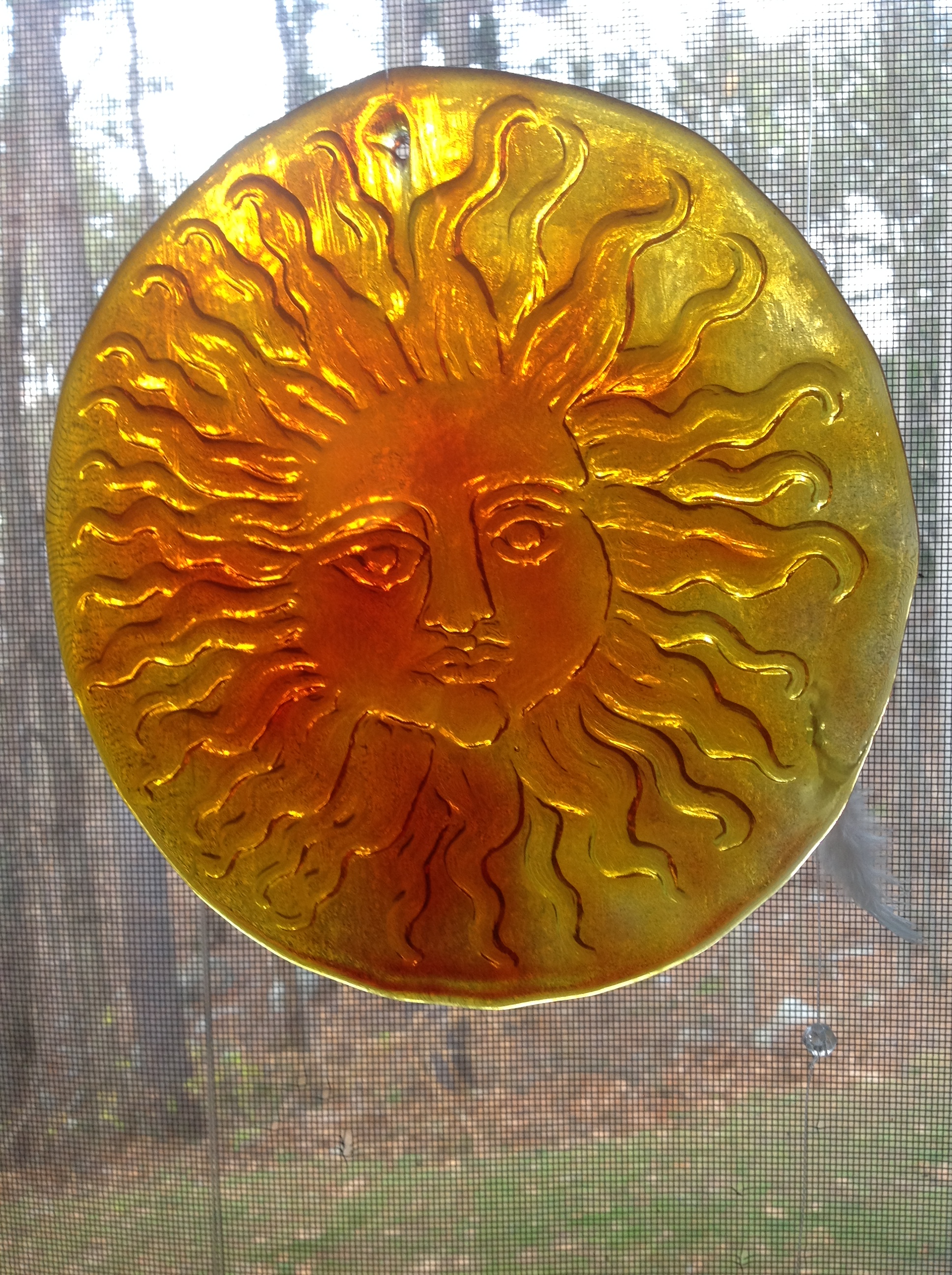 At Christmas my sister, a master of close ups, took pictures of two of my window suns. Both of these were given to me many years ago by my parents. You can catch a glimpse of my Christmas window decorations (feathers and beads).