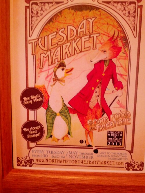 If only the Pinterest board collections would stay there. When I started pinning I found many great fox images and created a board called Foxes and Hares. Now, of course, I’m seeing foxes everywhere, literally. This poster advertising the Tuesday Farmer’s Market is hanging all over town.
