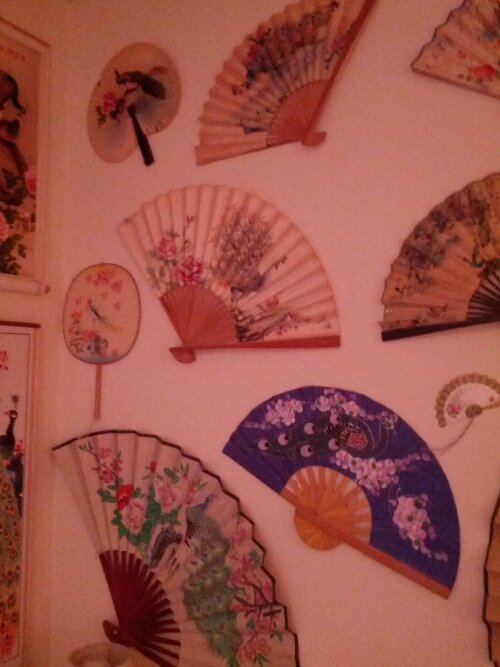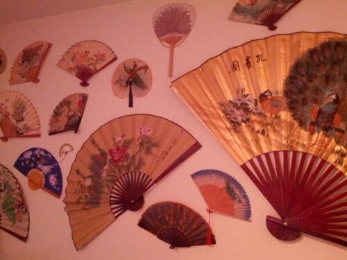 One of the collections featured in the guest bedroom is the Peacock Collection remaining from the time when it was our bedroom. A subset of the Peacock Collection is the Peacock Fan Collection.