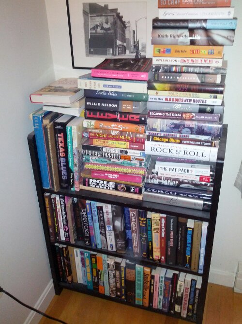 This overflowing bookcase houses our music books – books about music and musicians. There are many books about the blues and blues musicians, books about folk and country music and musicians, and books about tin pan alley and show music composers and musicians. There are several books about Cole Porter, Frank Sinatra, and Elvis. There is a book about rockabilly, a book about gypsy jazz and a rock and roll encyclopedia. It is a book collection that is a perfect complement to our record (ed music) collection.