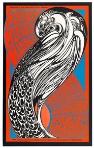 The Smith College Museum of Art has an exhibit this summer called Summer of Love, Psychedelic Posters from SCMA. This exhibit features posters from California and while the style may have originated there, posters from NYC venues at the time were very similar. I no longer remember anything about the one I had except the overall feel and the colors -green and orange. This Peacock image advertises a show by the Byrds at the Fillmore. It is similar, I think, in layout and lettering to the one I had and is one of my favorite in the show.
