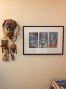 The first photo shows a grouping that includes two pieces by Denise Beaudet and two gourd masks as well as a spirit doll. The second photo shows a salon wall that features a collage by my mother, a horse from my grandmother’s horse collection, a painting on a feather – a souvenir that a friend brought back from Costa Rica, a painting on a leaf – a card my niece sent from England, another card from my niece, and a Will Barnet print – my sister gave us all Will Barnet prints one Christmas.