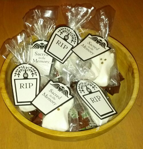 Making little paper ornament treats for my friends and coworkers has been one of my Halloween traditions for the past ten years. I find an image I like and (sometimes after a little engineering) copy it on card stock. Then I find an appropriate candy to add. This year I used two gravestone images and paired them with Peep ghosts. Another year when I was using a Day of the Dead image, I was thrilled to find some skull candies from Germany.