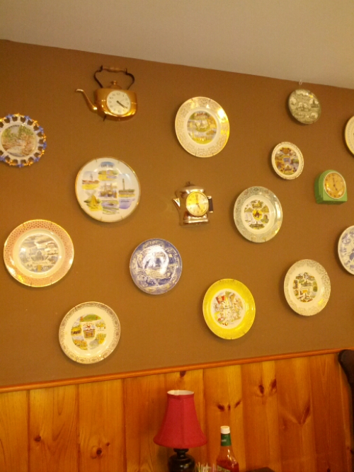 And the back dining room features souvenir plates and clocks on shapes (watering cans, football helmets, etc.)