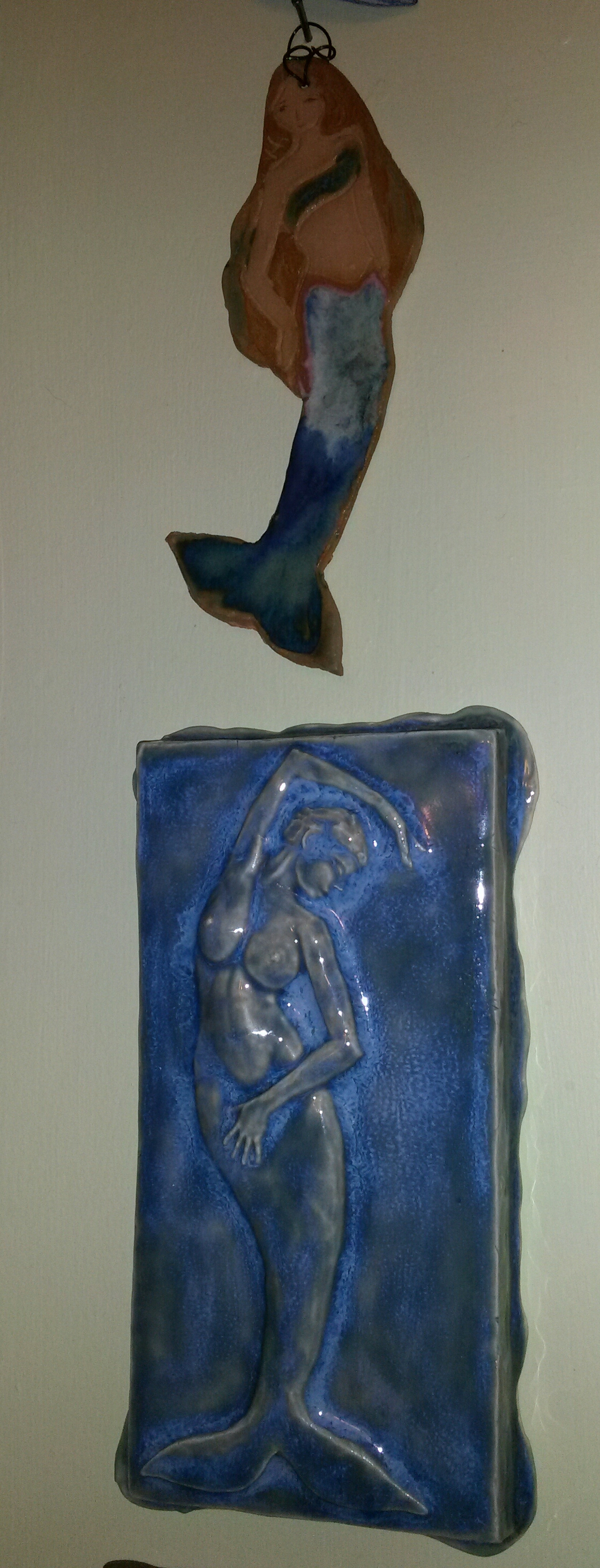 Vacationing at the beach always means finding many mermaids for possible purchase. We went to Rockport last weekend and ventured over to Gloucester and found this wonderful blue relief mermaid by Bliss Studios. She goes well with the one above (stamped PM Doll Leger Collection) that we bought in Rockport last summer.