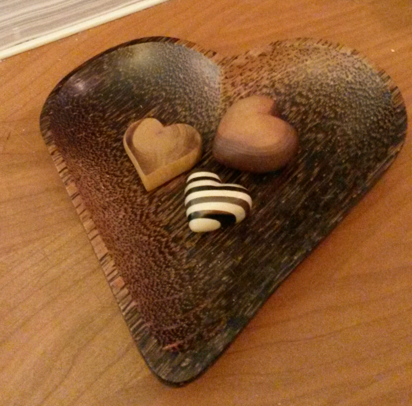 For the longest time I just had the wooden heart bowl. And then one day I bought a small carved wooden heart. It ended up in the wooden bowl and then of course a few months later I bought another wooden heart which joined the first. So when I saw the small striped heart at Arts Night Out last week I knew where it belonged.