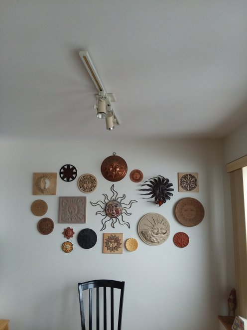 The dining room suns along with the copper sun mold from my sister that was in the kitchen and the small yellow sun from my brother in law that was in the downstairs bathroom have been installed in the dining room! The arrangement is quite different incorporating not only the two new additions but the two that had been off to the side in Massachusetts.