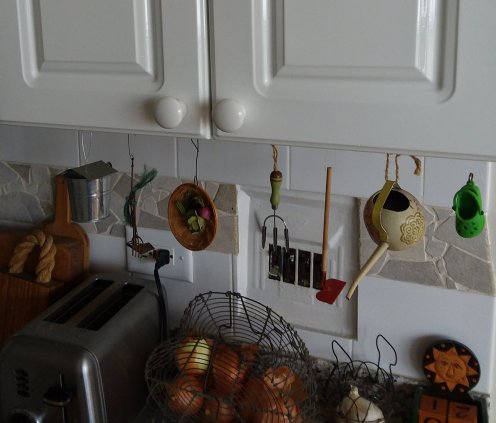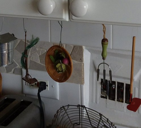 And then when I thought I was finished I walked into the workroom and saw the small flat basket with tiny vegetables that had been my mother’s. I realized it would be perfect and so I glued down the vegetables and hung it up as well.