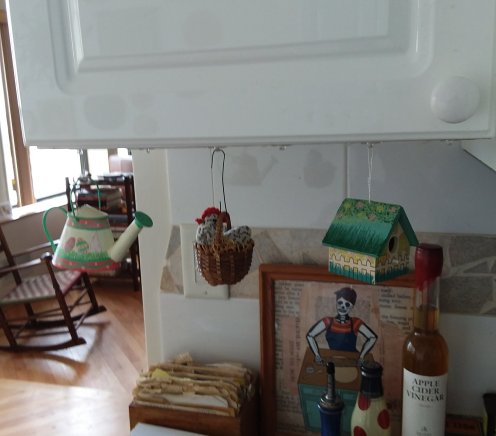 Finding a living Spring branch in the city seems even more daunting than finding a fallen Fall branch. Perhaps next year we will find something at or near our daughter’s house but for this year we are going without. I had been feeling sad that I wouldn’t get to use the maple syrup bucket, with no tree, but after I hung up the gardening ornaments I realized the maple syrup bucket would be a great addition.