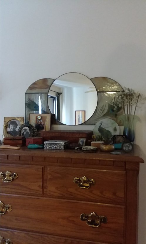 The good news about the peacock collection is that since my dresser can fit in the bedroom here the peacock mirror hangs in its proper place.