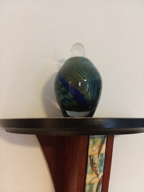 On the right side of dresser is the glass vase from my younger daughter that kind of looks like a mermaid tail and a peacock tail at the same time (perfect!), a little pouch with a beaded peacock from friend Jen, and a decorative plate from my parents.