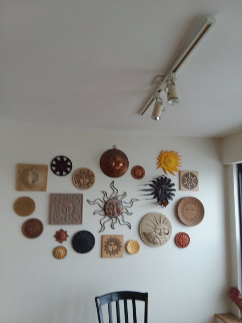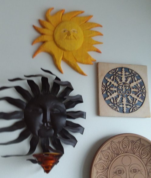 When my husband’s brother and his wife visited in the Spring he asked how many suns he had contributed to the sun collection. The answer was most of them. And when they came at Christmas they brought us another one – this carved yellow one – as a house warming present.