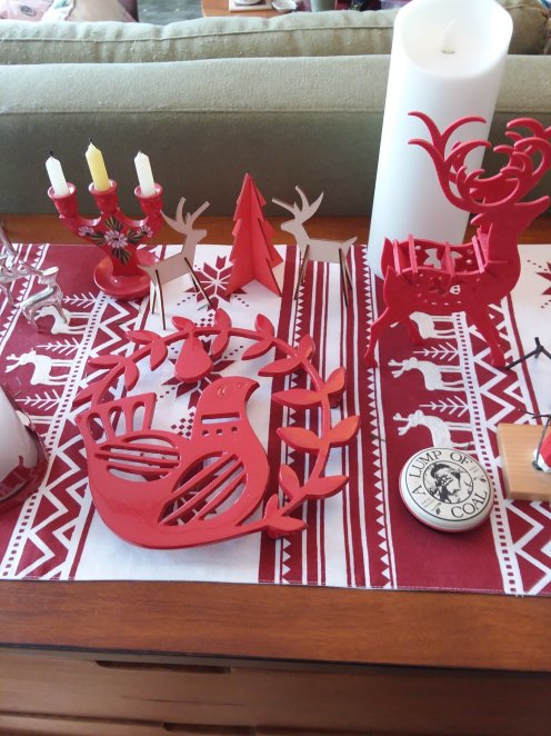 The red partridge and a pear tree trivet our youngest daughter gave us found an immediate temporary home on the Christmas decorated sideboard.