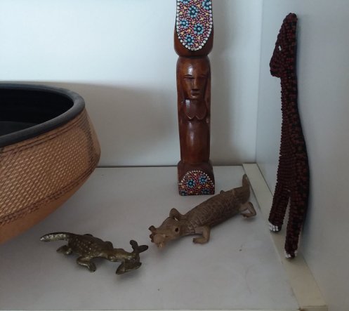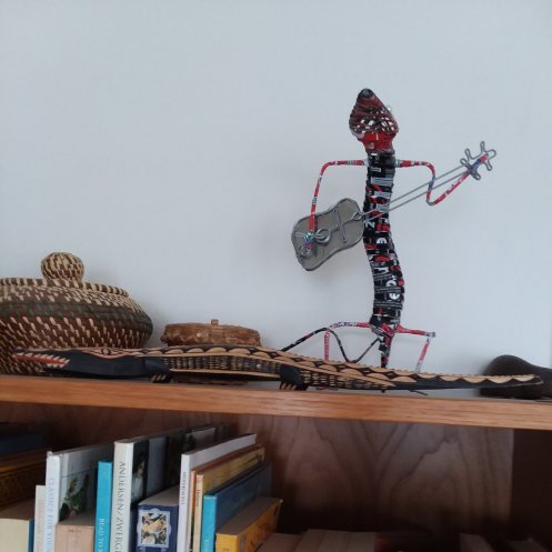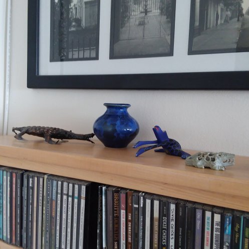 1. Alligators and a frog on the windowsills in our bedroom. 2. The woven alligator sits atop a sensor above the bedroom door (a nod to all the “guys” that used to perch above door frames. 3. This guy (a painted and altered seed pod) who used to be on one of the black boxes in our bedroom is in the living room now atop the first CD cabinet. 4. The guitar playing guy also moved from a black box to join the wooden alligator with a broken jaw on top of the living room bookcase. 5. Two carved alligators lying on top of the “new” living room bookshelves (they used to be in the workroom) 6. Transplants from the old CD shelves sit on the “new” CD shelf (it used to be the paperback bookshelf). 7. The alligators with fishes in their mouths from the old CD shelves on the “new” living room bookshelves. 8. Two frogs and a turtle from the CD shelves and the glass turtle that used to be in our bathroom on the second CD cabinet. 9. Two Valentine frogs and a turtle lamp from friend Susan still live on a bedroom dresser.