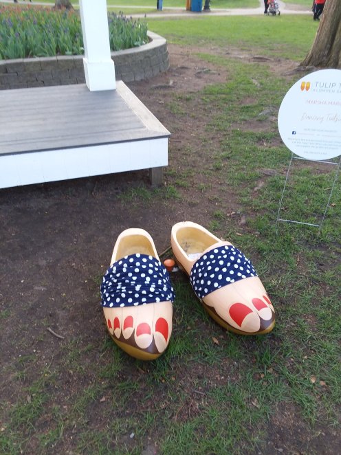 In addition to all the tulips in Holland, Michigan during Tulip Time there are a lot of wooden shoes and references to wooden shoes. “Wooden shoe like to (do this or that)?” appeared on lots of signs and souvenirs. Most store doors had signs asking those wearing wooden shoes not to wear them into the store. And there was the Tulip Time Klompen Garden – 45 artist painted “wooden shoes” nestled among the tulips. Klompen is the Dutch word for wooden shoes and klompen cakes are pancakes hence the “Klompen Cakes on a Klompen” by Donna and Gary Bogle: