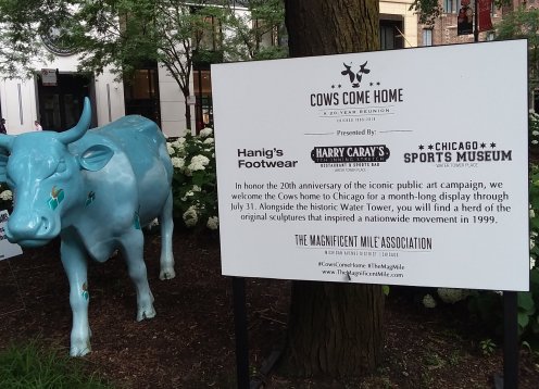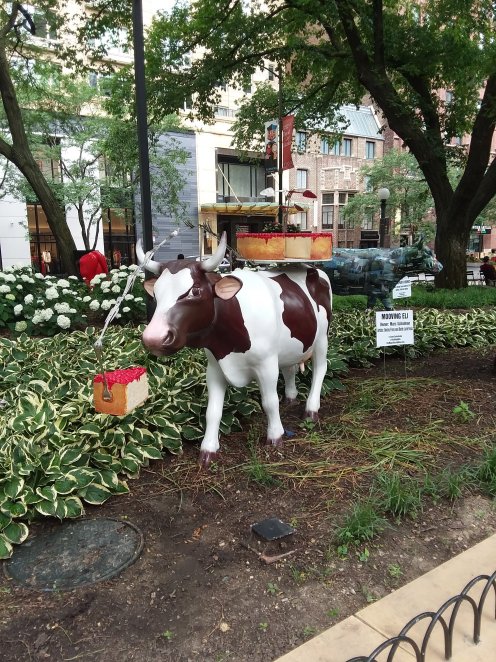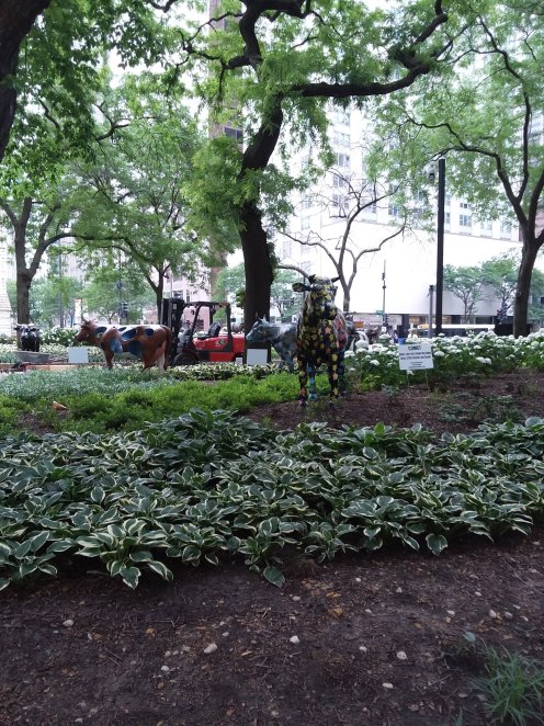 Since I have always been fascinated by seeing the same subject portrayed by different artists, I have always loved it when cities have artists decorate multiples of an animal or object. Since I also love to research my interests I’ve long known that allthough I don’t think I became aware of this phenomenon until the first time Easthampton did bears, it started years before with the Chicago cows. So it was fun to find out that for the twentieth anniversary of that seminal event some of the original cows are being displayed again. There is a small herd of them hanging out in a small park on Michegan Avenue. Here are a few: