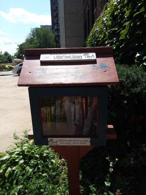 As a voracious reader who could never afford to buy or store all the fiction I consume I have always loved public libraries. So of course I love the Little Free Libraries that have been cropping up around the world since the first one was built in Wisconsin in 2009 by Todd Bol as a tribute to his mother. Little Free Library is a 501c3 organization and people who want to become a volunteer steward of a box can buy one on the Little Free Library website. There are several different models of them. I snapped a picture of this purchased one on my way to the Uptown branch of the Chicago Public Library.