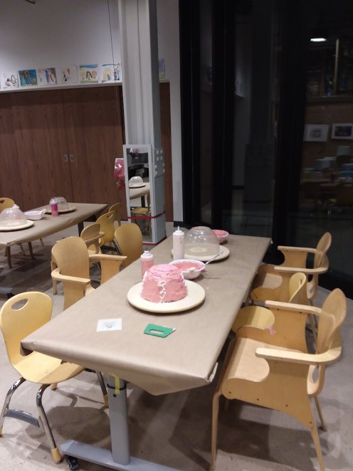 After people had finished decorating their cakes which could take quite awhile, we scooped the “icing” back into the bowls so the next person could get started. It was really busy in December and this project was really popular and really messy! These pictures were taken at the beginning of the day the tables looked very different by the end of the morning.