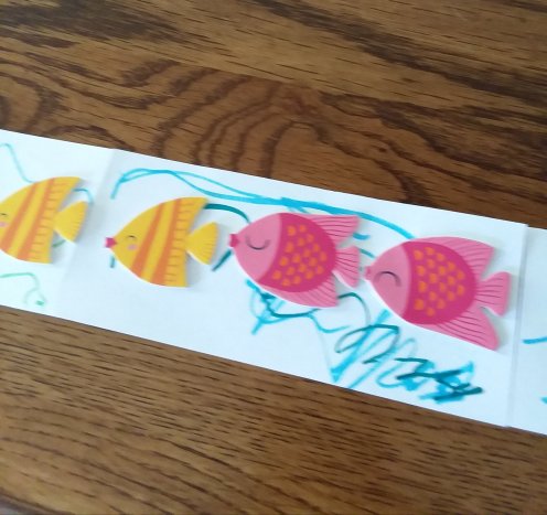 The next day Older got a puzzle and Younger some fish stickers. I had packed these with some short scrap pieces of paper and a few markers. I introduced the idea of drawing some water and she got the idea to tape the pieces together to make one long picture. It’s so long I didn’t even get all of it in the picture.