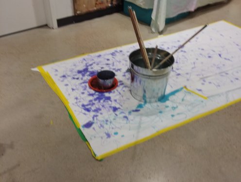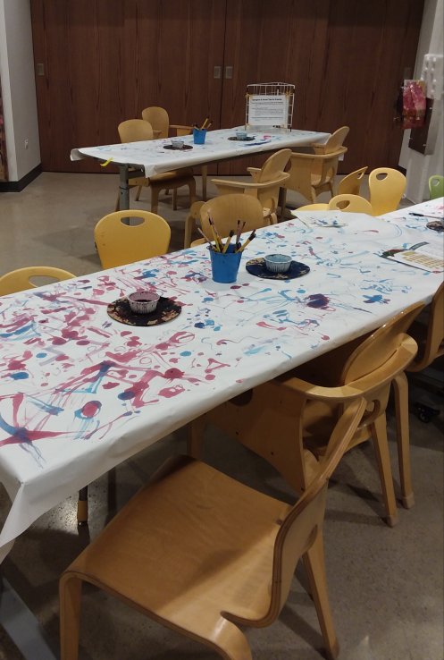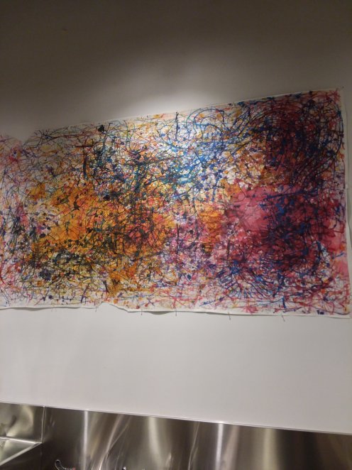 We also had a few long pens and a piece of paper taped to the floor. One of the museum preparators carved nibs on the end of the long dowels. It was fun to watch how different children moved as they drew with these large pens. Some just stood still and reached out with their arms. Some walked and dragged the pen along behind them. One little girl danced as she drew. The accumulated effect of all the lines and some spills was beautiful and the finished piece is hanging above the sink now and getting lots of compliments.