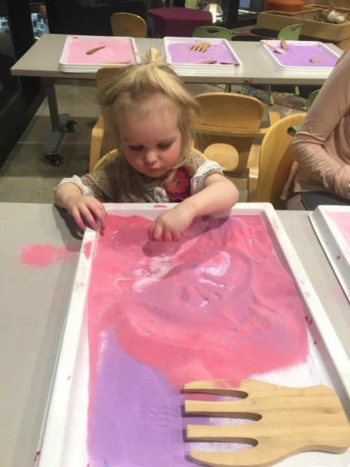 We also put out trays with salt mixed with powdered tempera paint and lots of wooden tools (forks, knives, salad tongs, combs etc. from my collection) for mark making.