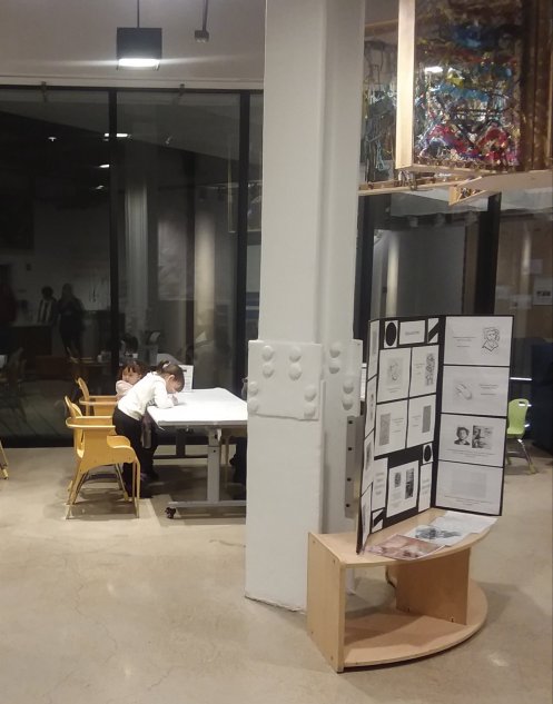 For the second and third months of Drawing Lab we focused on dots and lines. In March the tables were covered with paper again and the easels were set up in the open space. Then we randomly added some colored sticky dots. We also gave some dots to each guest and suggested they add them to the paper and then create a drawing by connecting the dots or using the dots as a starting point.