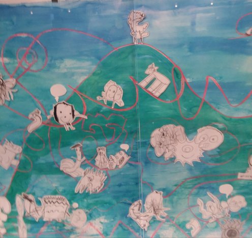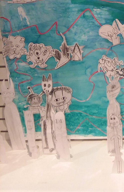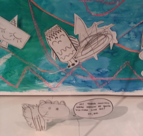 Another technique I was excited to see in action was a technique the Chicago Imagists called “exquisite corpses”. I had not heard of the Chicago Imagists before I moved to Chicago but there was a big focus on these artists of the late 60’s this year so I’ve been learning a lot about them and seeing a lot of their work. The “exquisite corpse” technique involves collaborative drawing on a piece of paper folded so an artist can’t see what the previous artist has drawn. At the museum pieces of long paper were divided in thirds for this technique. On the day I volunteered I tried to get some children to do it suggesting that one draw a head and then passing it to the next child to draw the torso and to the third to draw the legs. Two children tried to do it with one drawing the head and legs and one drawing the torso but when it was passed back to the first child he erased what the other child had done and drew his own torso and legs. When I tried it with my nephew and his 6 year old son when I visited them in May my grandnephew looked at the result, said no, and turned the piece of paper over and drew a monster all by himself in the three spaces. Looks like a few people used the technique, though: