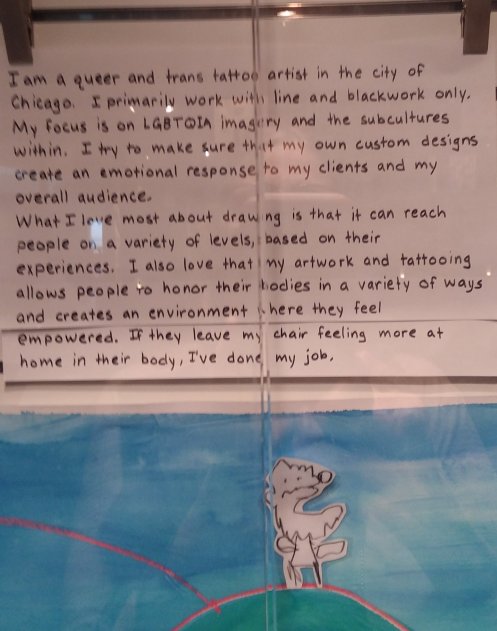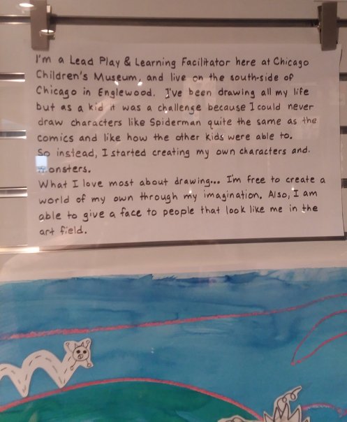 Tattoo artist Ricki Proper and artist Josh Seals who is a Chicago Children’s Museum Lead Play and Learning Facilitator came to the studio for a week of Drawing Lab and introduced some drawing techniques that visitors used to create drawings of monsters that are currently being featured in the museum display case.