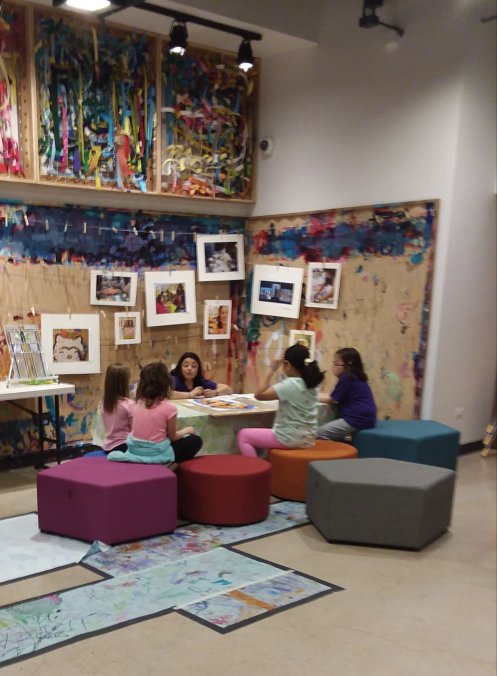 Artist and community activist Diotzinantzin Rios-Sierra came to the art studio this Spring. The Children’s Museum was one of the sites that made mosiac butterflies to be installed along Armitage Avenue as part of a “Here to Stay” Logan Square Neighborhood Association initiative. Before they began to work on the butterflies, guests participated in a discussion with the artist about mosaics and migration and butterflies as a symbol for immigration.