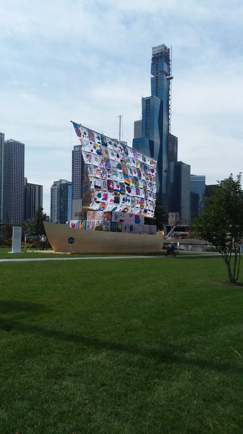 The 50 foot tall ship is installed at Navy Pier in Polk Brothers Park. While it’s not in a lake like it was in the promo photo taken in Switzerland, it pretty impressive with the city buildings in the background.