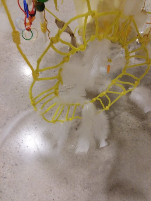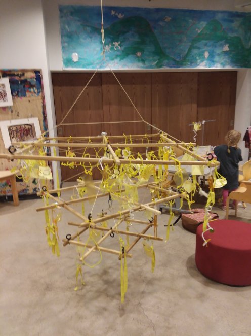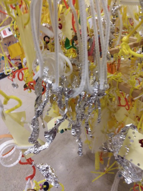 Pipe cleaners, yellow “post its”, and plastic milk bottle rings were the consistent materials. Other materials we introduced throughout the project were beads, buttons, ribbons, yarn, fabric, tinfoil, feathers, flowers, sequins, popsicle sticks, old jewelry, and tissue paper. What I loved about the project was how differently guests used the same materials. Also that many families made seperate pieces and then combined them – a collaboration for the collaboration. The wooden mobile frame was attached to the pulley system and lowered each day.