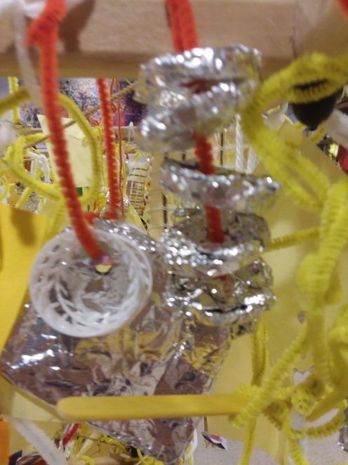 My favorite project this year was June and July’s chandelier sculptures. Inspired by hanging art especially the Healing Machines of artist Emery Blagdon and utilizing a wooden mobile that had been used for another hanging collaboration at the museum before, Liz conceived a light/sun chandelier to combat the long Chicago winter.