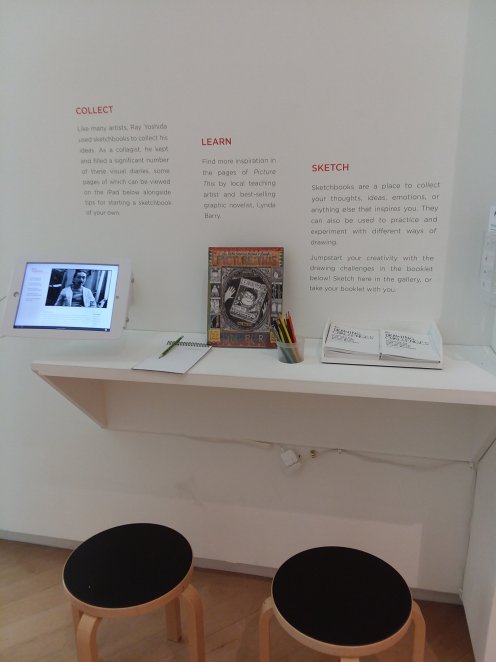 It was fun to walk into the Ray Yoshida exhibit and see the Lynda Barry book on drawing that Liz had recently lent to me. The “sketch book” includes 6 Drawing Challenges inspired by Ray Yoshida, Lynda Barry, aand Ivan Brunetti.