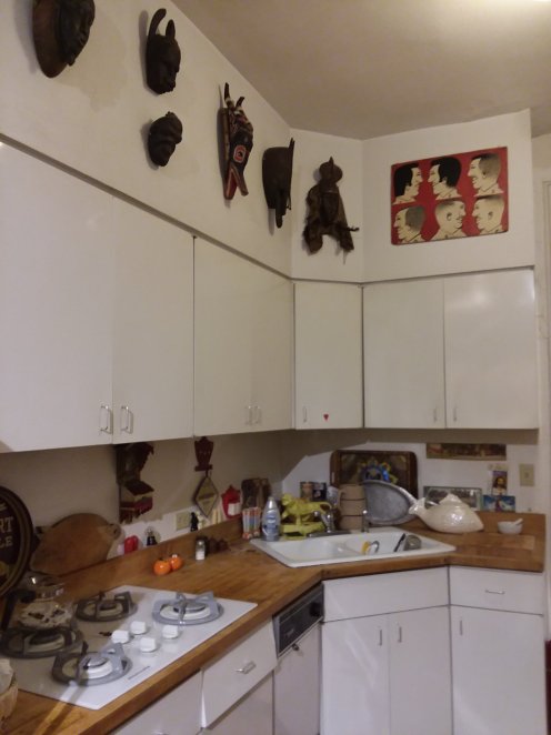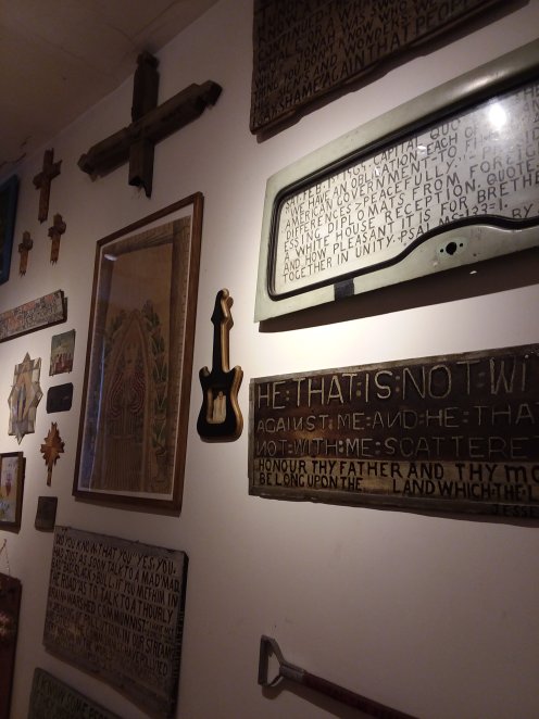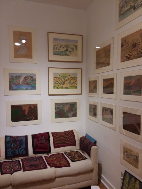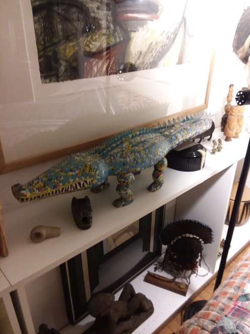 Roger Brown, a Chicago Imagist, left his home with his collections to the School of the Art Institute of Chicago and I was lucky enough to get to see it (visits need to be arranged) last year as part of the Intuit summit. He collected the work of other Imagists, outsider artists, folk and indigenous art, popular culture objects, costumes, textiles, furniture, souvenirs and more! He lived above his studio/gallery in a small apartment and it has been preserved with all his collections intact. It was amazing to see works by Howard Finster, Henry Darger, and other artists whom I’m used to seeing in museums casually displayed in a home.