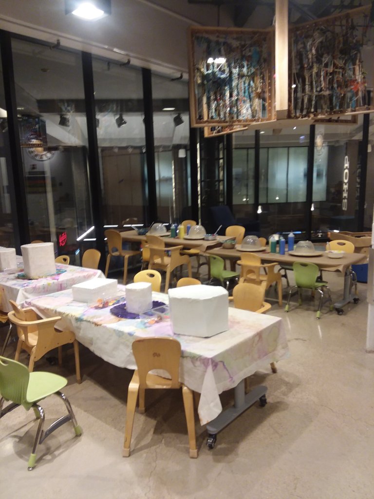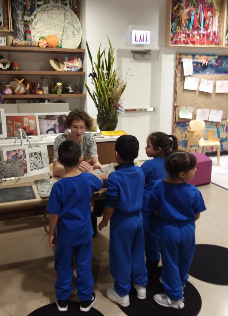 One week guest artist Ione who creates prints with found texture pieces talked about her art and set up a texture area for large rubbings.