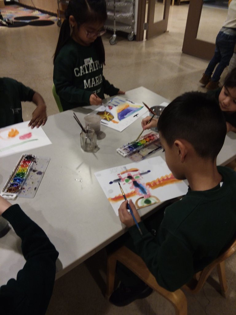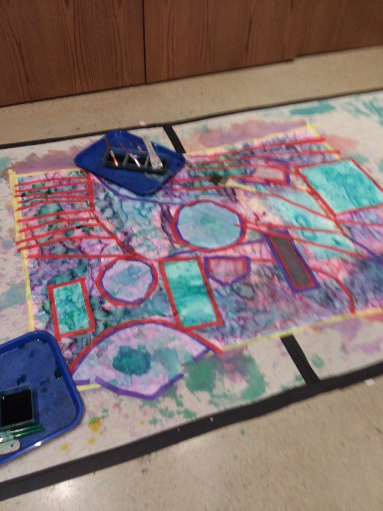We have been exploring watercolors in the art studio this Winter. In addition to the traditional watercolor palette and brushes on the tables there are also a series of large collaborative floor paintings being created with liquid watercolors and large brushes, sponges, and droppers.