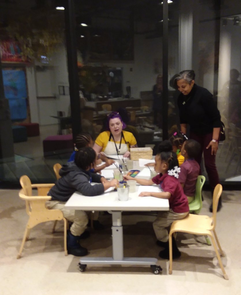 Liz talks to the visitors especially school groups and their teachers about using the brush to create varied painted lines and about the importance of small motor development citing a New York Times article about how the decline of art experiences in childhood is affecting the ability of surgeons. https://www.google.com/amp/s/www.nytimes.com/2019/05/30/well/live/surgeons-hobbies-dexterity.amp.html