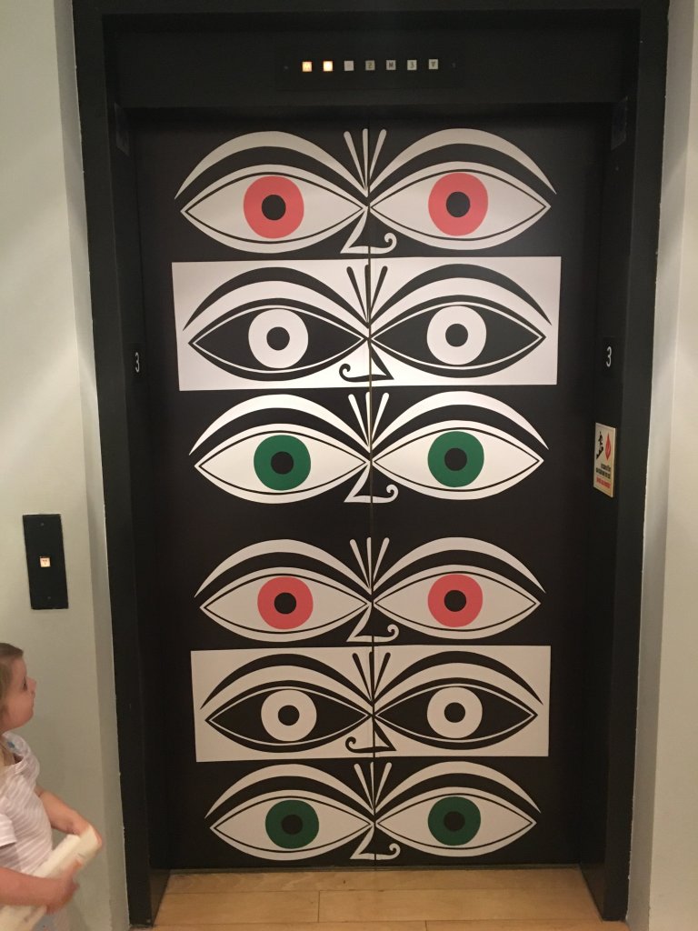 Right before the coronavirus hit the United States and right after an Alexander Girard exhibit ended there Liz went to Palm Springs. Although the exhibit “Alexander Girard: A Designer’s Universe” was no longer at the Palm Springs Art Museum vesitages remained and since she had often heard me speak of Girard and of the restaurant La Fonda Del Sol, Liz texted me some photos.