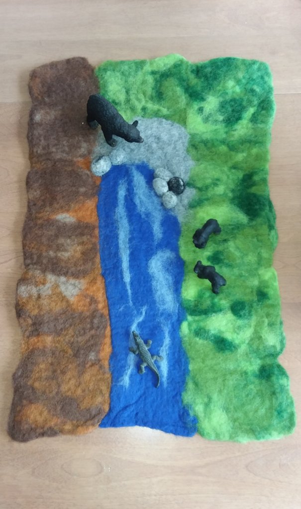 After making three layers of each color I decided to just go for it in terms of the actual wet felting as well since I didn’t quite remember how to do it and a lot of the directions I read were conflicting and confusing. I used a combination of rolling it in bubble wrap and a rolled up bamboo mat, patting it with my hands, and rubbing it with a small bamboo mat and it worked! I am so pleased with how it turned out. I needle felted some rocks to it after it dried.