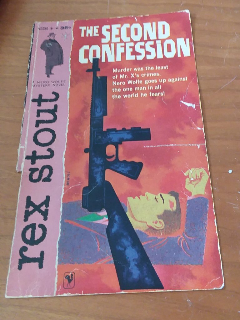I am still reading my way through my Nero Wolfe collection. All but two of the books are paperbacks and I bought most of them at used book stores but I found my first few copies under my mother in law’s bed. A couple of them are from the era when paperbacks had illustrated rather than photographed covers and when I started reading “The Second Confession” I kept turning it back to look at the cover which was practically detached. I was ready to begin cross stitching another piece and I realized I could recreate the cover.