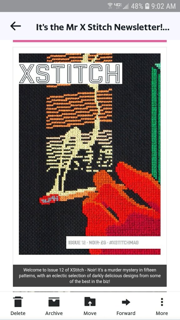 I had already begun embroidering it without solving the problem of the small type at the top. Of course I couldn’t actually cross stitch the words but I knew if I left it blank the design would be unbalanced. I had been working from the top and had just gotten to that area of the piece when I got the Mr. X Stitch newsletter email from Mr. X Stitch touting the latest issue of their magazine which features 15 noir designs. Not only did this prove just how on trend I can be, it solved my design problem. The cover of the magazine had an image of a hand holding a cigarette with what looked to me like lines of type. AhHa, problem solved.