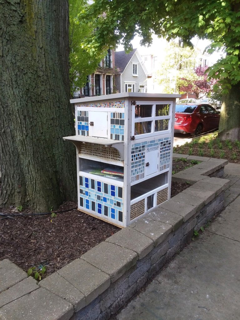 Look at that tilework! Now that my virtual collection (in posts Little Free Church Library. Sheboygan Little Libraries, and Another Little Church Library) is growing I’ve really got to take a walk up Addison to take a picture of the Snoopy doghouse little library I keep seeing from the car.