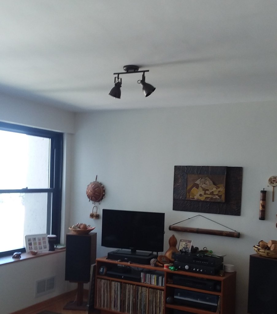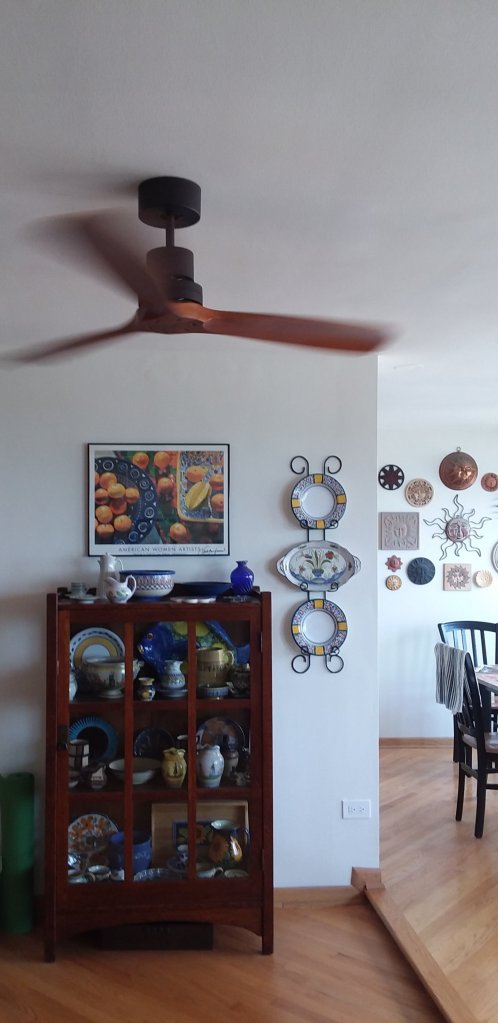 There is one light we love in our condo. The light in our bedroom is in a ceiling fan. We had never had a ceiling fan before and now we are ceiling fan converts so we wanted one in the living room as well. There was a capped outlet in the open part of the room and the electrician was able to get it working again so we ordered a fan as well. I think it helps to fill the space in this oddly shaped room and it really helps to move the air conditioning to the couch area.