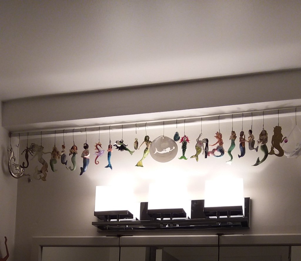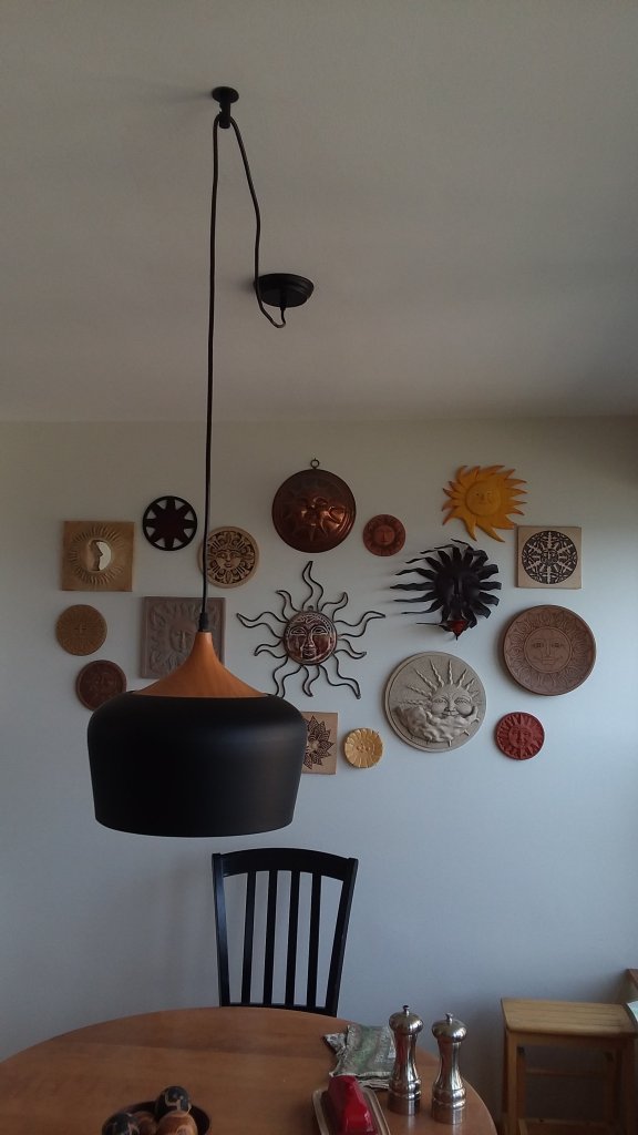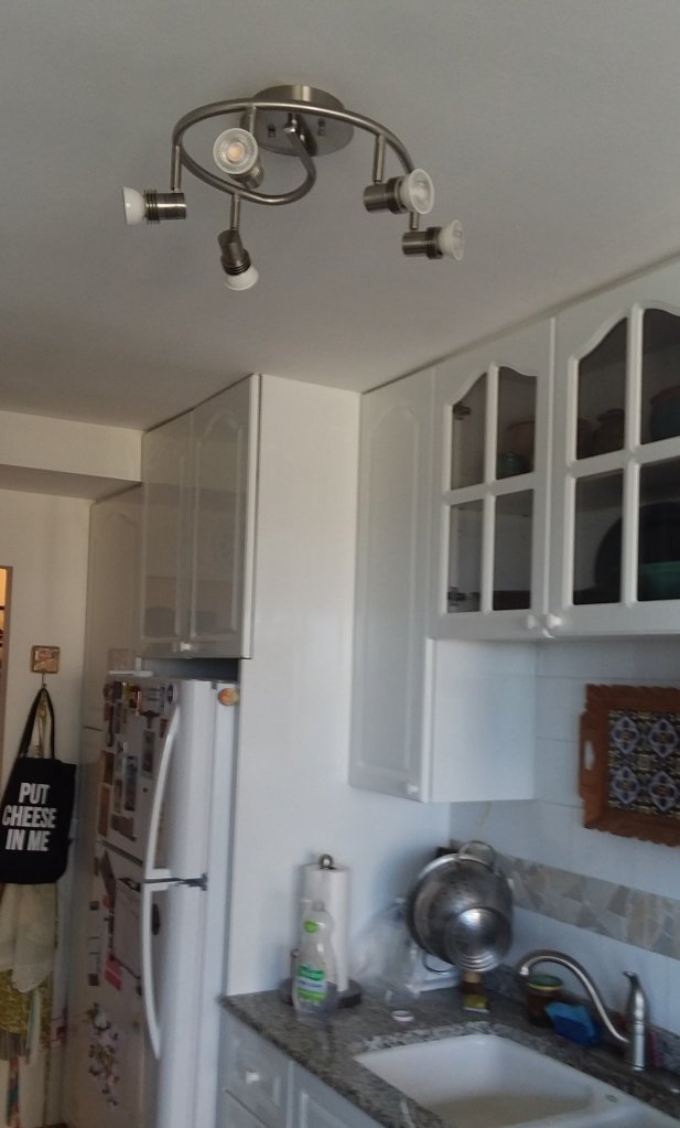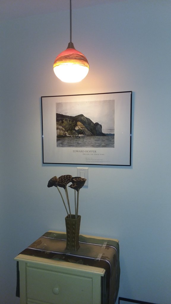 We’ve been hooked on the HGTV show House Hunters ever since we started looking for our new condo. The house hunters often act like a house is either “move in ready” (perfect) or a “total gut job”. I think there are another two categories: “I wouldn’t have chosen it but I can live with it” or “I can live with it for awhile.” The light fixtures in our new condo belonged to the second category. There was mostly long white track lighting which wouldn’t have been too bad despite some odd placement except for the yellow discoloration. At some point after we moved in the track in the entrance hall broke and that along with a desire to hang the handmade glass globe light that was my mother’s led us to a decision to call an electrician recently and replace almost all the light fixtures in the condo.