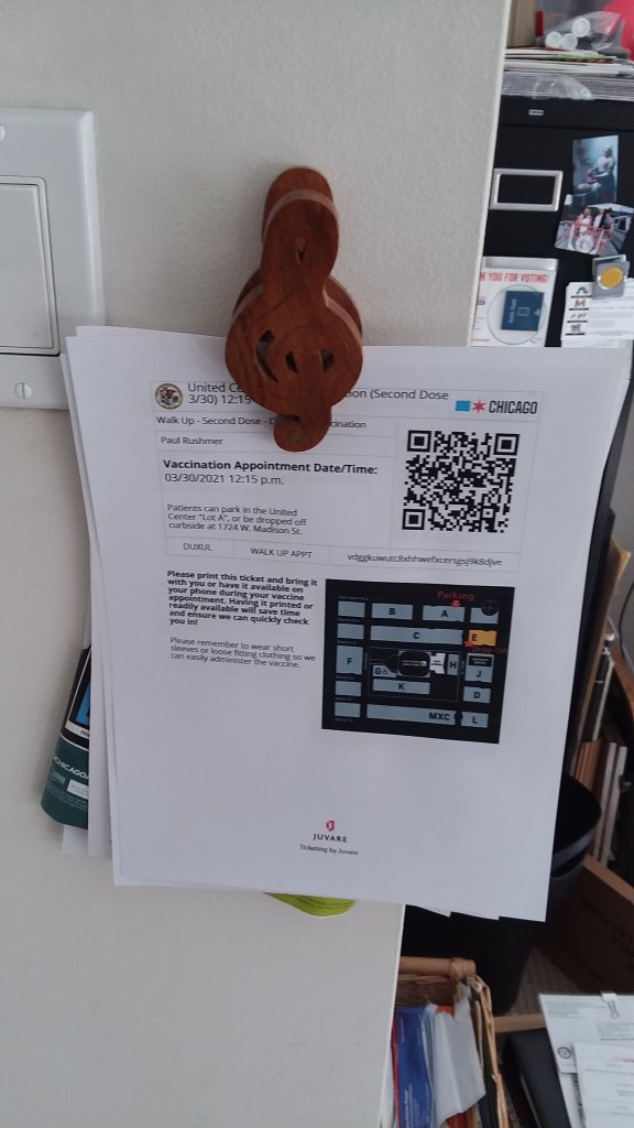 And this musical note clip is meant to be holding our tickets to upcoming concerts. It does still hold the tickets to the Liz Mandeville concert at Buddy Guy’s last March that we decided we better not attend. But now on top of those tickets it holds our “tickets” for our second coronavirus vaccine appointments next week. Here’s hoping that means tickets to concerts in the musical clip and guest coats in our closet soon!