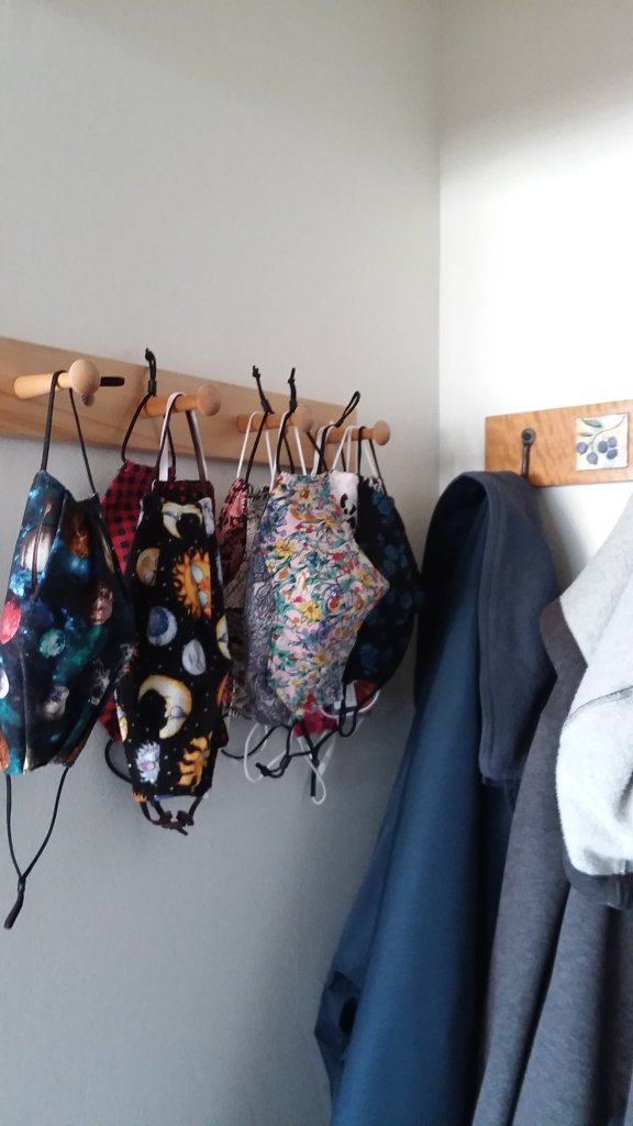 When we added this peg rack to our hall alcove last year our thought was that it would be used for guest coats but it turned out it was for our face masks.