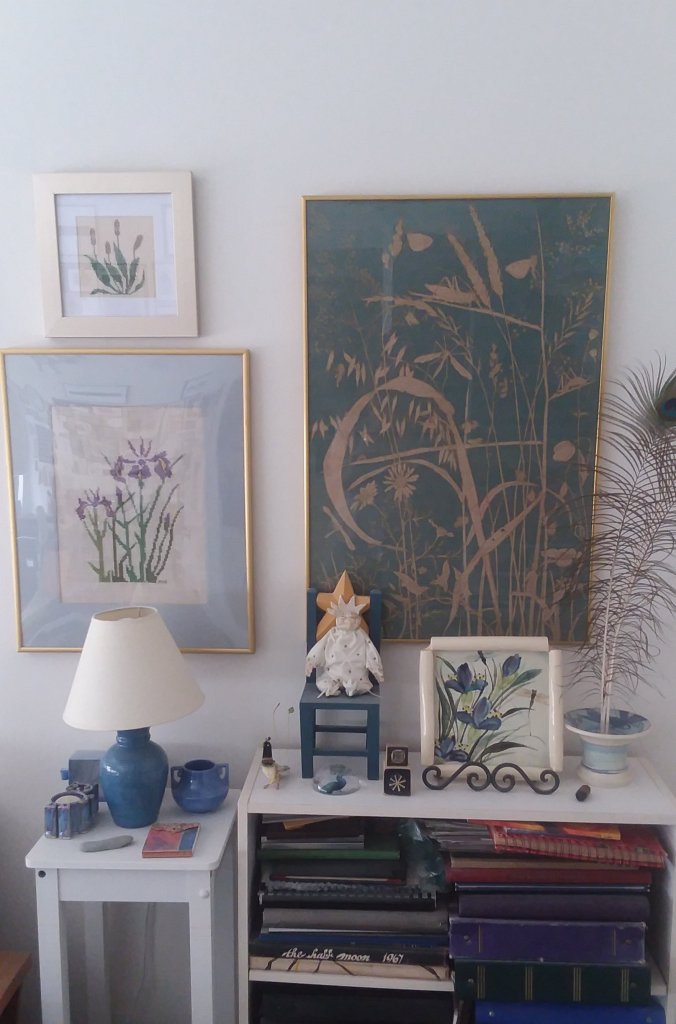 This is the only piece I shared that I didn’t design. I shared it on Day 8 Most FAQ’S since most questions people ask me are technical rather than creative. This piece used to hang in my parent’s bedroom along with another botanical piece I stitched from the same book Cross Stitch Embroidery I by Gerda Bengtsson. The matted and framed pieces had some foxing damage so I took the frame apart and salvaged this one. I was so glad to find this gold frame which went well with the other gold frames in the workroom. It hangs above the iris piece which is hung pretty low since it is covering a large circuit box.